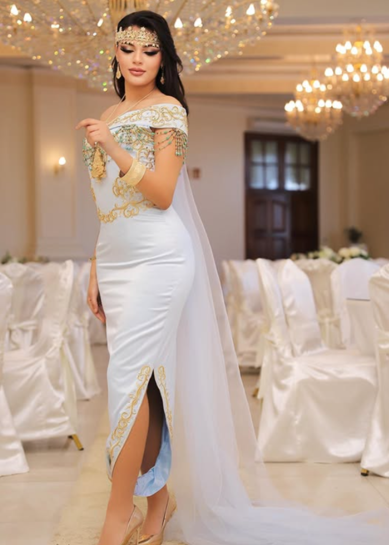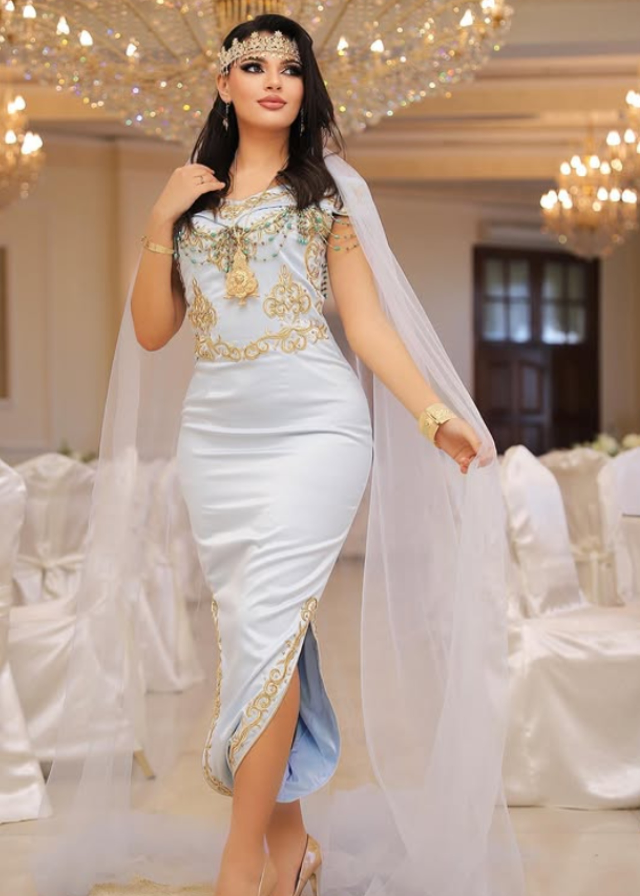 Robe traditionnelle moderne en satin bleu ciel, sublimée de broderies dorées et d’un voile délicat. Inspirée du style oranais/constantinois, cette pièce élégante est idéale pour une soirée de fiançailles ou un événement raffiné.