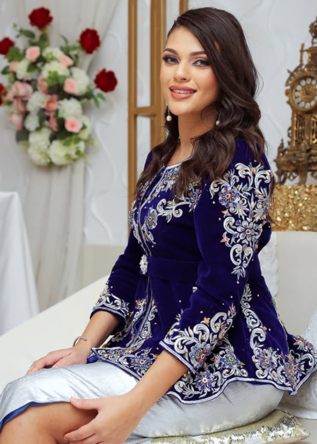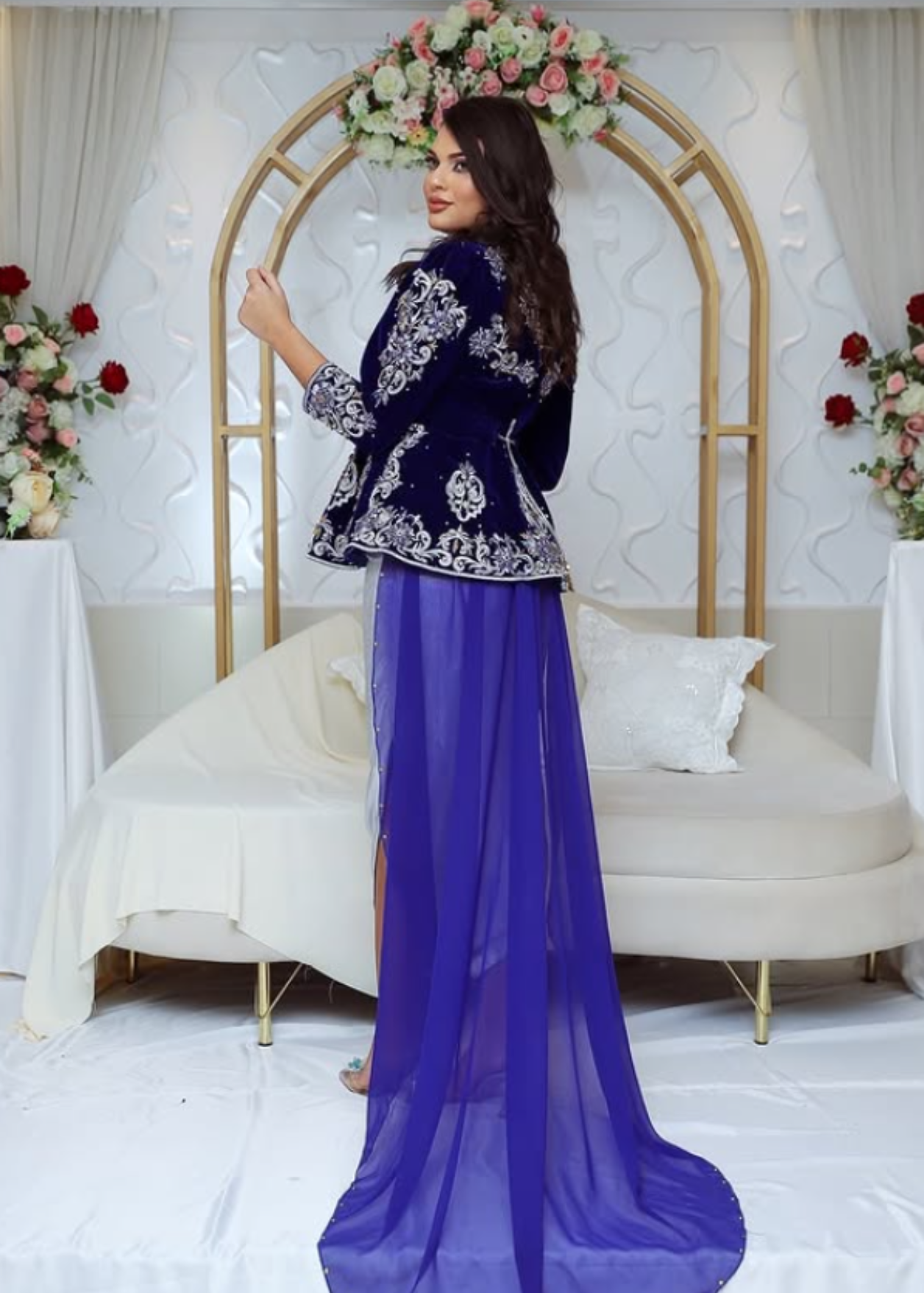 Ce somptueux Karakou en velours bleu royal, richement brodé de motifs argentés et dorés, incarne l’élégance de la tradition algérienne. Il est accompagné d’une jupe longue argentée satinée avec une fente élégante et un voile assorti. Parfait pour une mariée ou une invitée distinguée lors de fiançailles, henné ou mariage.